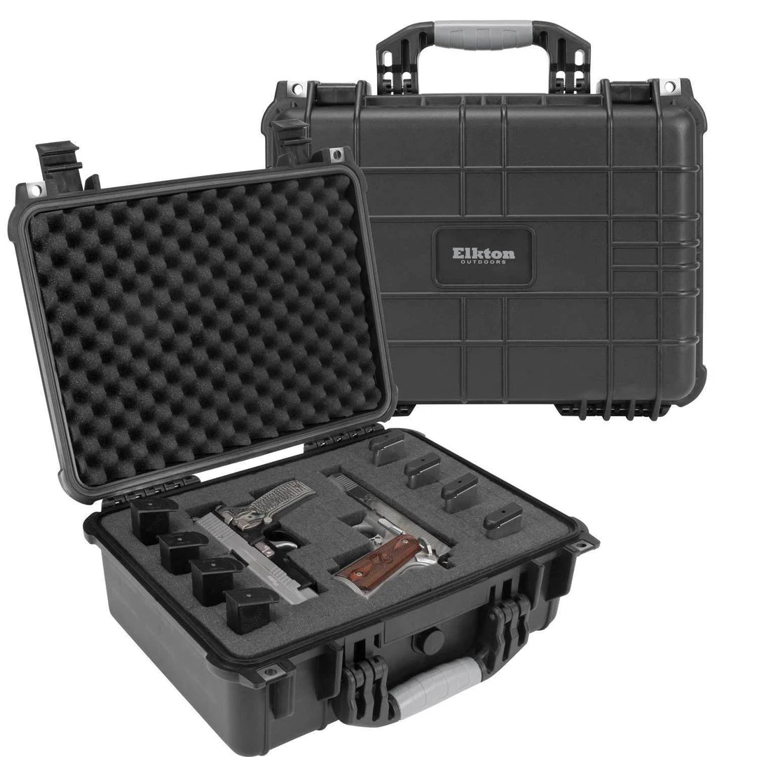 Elkton Outdoors is proud to introduce the highest quality hard gun case available! We know the importance of functionality and safety when it comes to transporting and storing firearms. Our gun cases include a fully customizable multi level foam interior so you can arrange your gun case to your ideal specifications. We have also ensured this case is nearly indestructible by making it waterproof up to 3 feet and crushproof up to 2,000lbs. This travel gun case is ideal for trips because we have integrated an automatic pressure adjustment valve allowing the internal pressure of your case remains the same during changes in elevation. Our cases include reinforced plated lock holes to ensure your firearms will remain safe while not in use. Each hard gun case was developed to the highest safety and quality standards so you know when you order an Elkton Outdoors gun case you are buying the best!