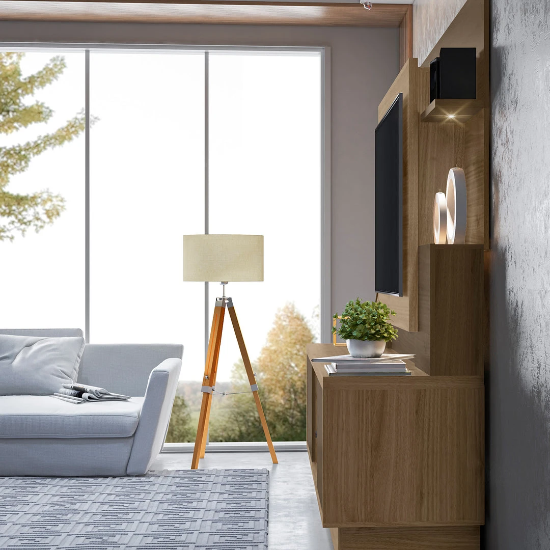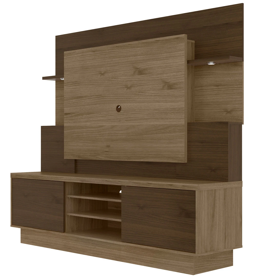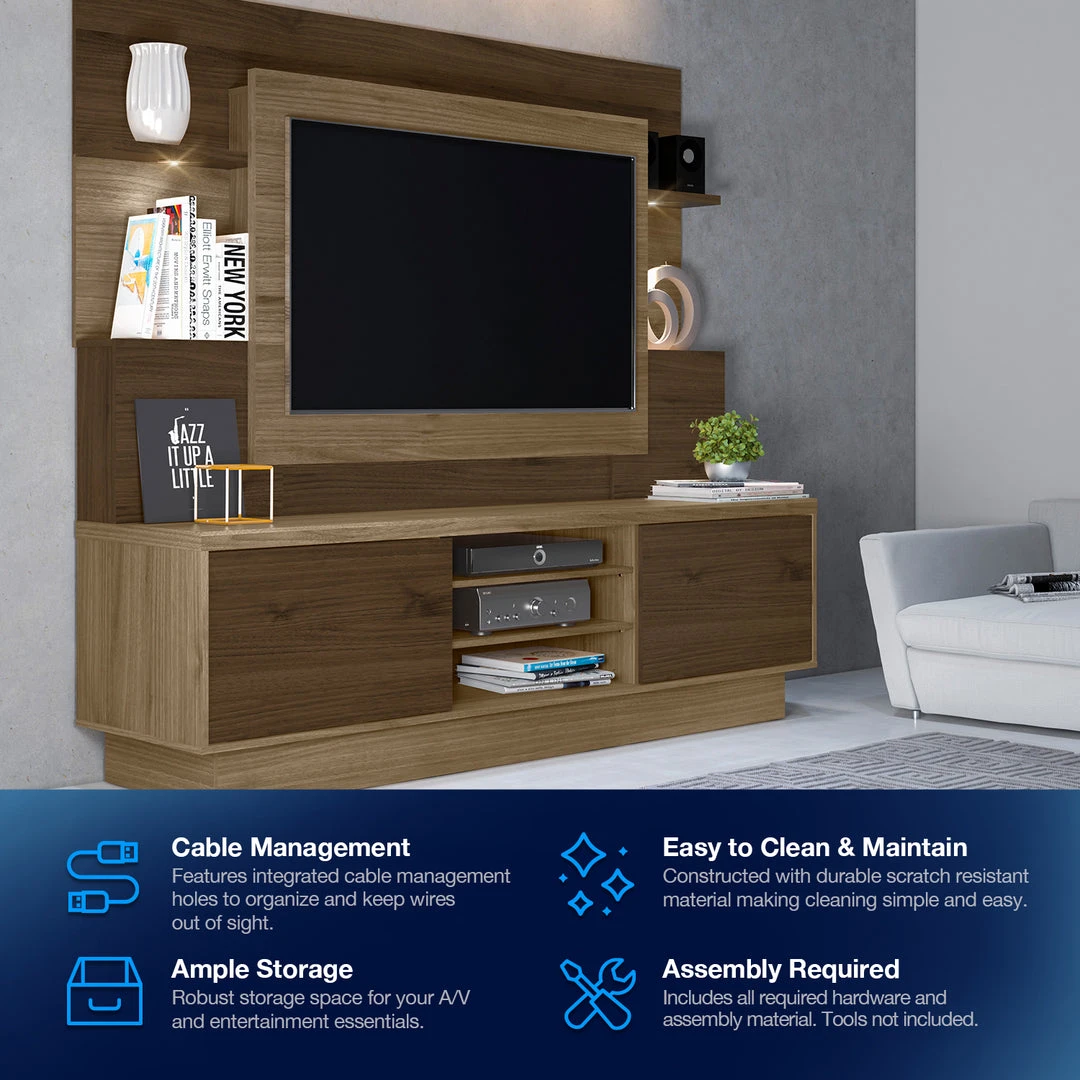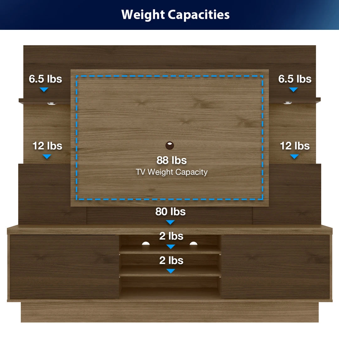 Combining contemporary design and functional craftsmanship, the Home Aron Lighted Media Center is every entertainment aficionado’s dream. Measuring 78.75″ in Width, 71″ in Height, and 19.25″ inches in depth, it can hold a 55-inch TV, speakers, and other media components. It has 2 sliding doors on the lower panel and a total of 8 shelves where you can display your DVD collection, movie memorabilia, or room decors.