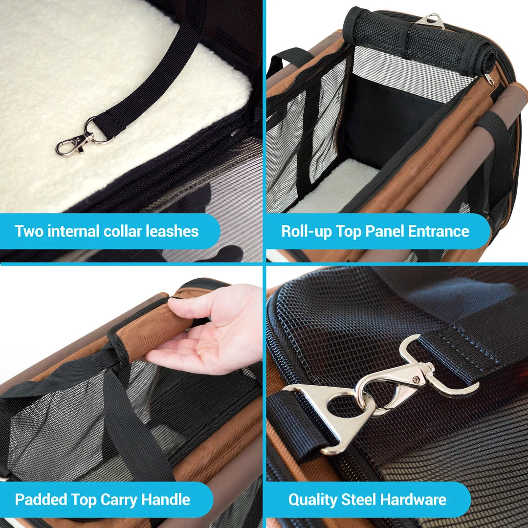 It comes with two entryways: a wide front door with zipper and a roll-up top panel for easy access. It has a spacious interior with a soft removable pad so animals can have a comfortable and restful time while traveling. All panels of the carrier are highly breathable so your pet stays cool and relaxed inside. Two collar leash clips are put inside for extra security.