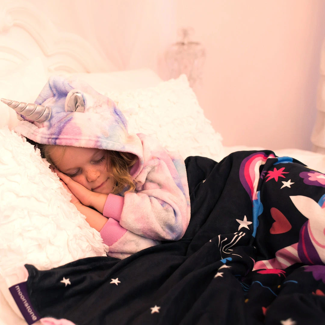 Moonstone’s kid-size weighted blankets help children get better sleep through touch therapy. This process creates a cocooning effect, which is similar to having your child being wrapped in a soothing embrace!