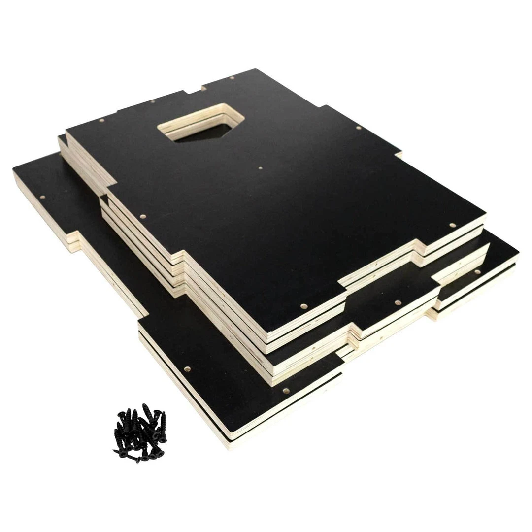 The Ultra Fitness Gear 3 in 1 Plyo Box is made from high grade 3/4 inch plywood. That means you can train as often and as hard as you can and never have to worry about damage to your plyometrics box. Ships flat pack, precut, with predrilled holes. Everything you need is included. We’ve assembled our box in less than 10 minutes with a powered drill.