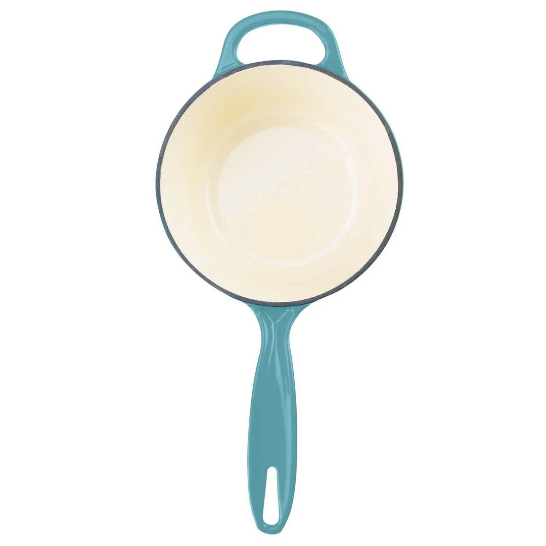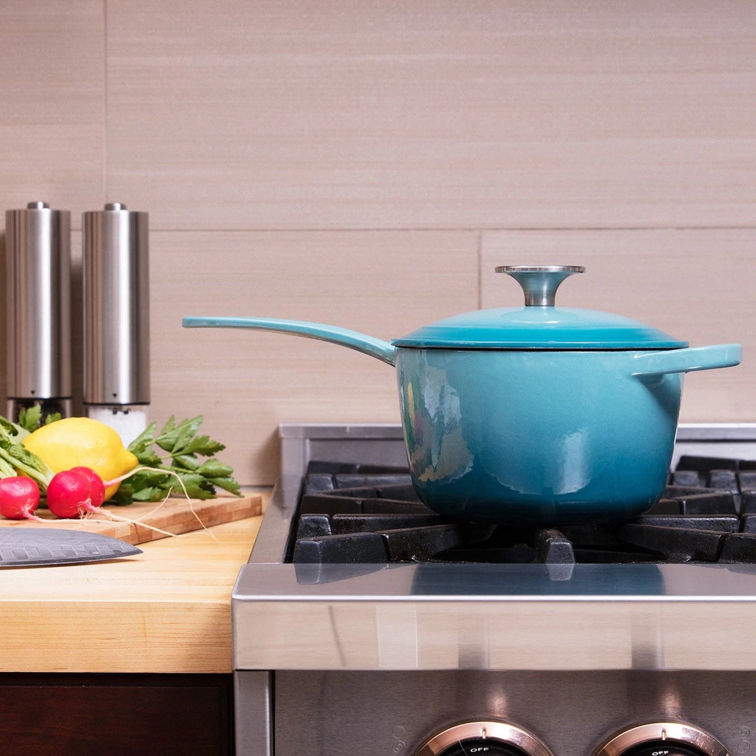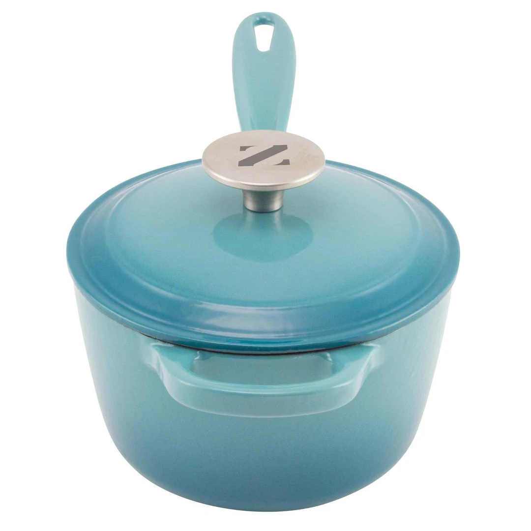 This covered sauce pot is so versatile, you’ll use it every day. The heavy-duty cast iron construction distributes heat evenly so you can create soups, stews, and delicate sauces. The lid fits tightly to hold in flavor and the underside is covered with self-basting condensation bumps to keep your favorite recipes moist.  Available in teal, orange or red, it looks great on the pot rack, stove, or dining table. Engineered to resist staining, the three layers of porcelain enamel create a durable, chip-resistant finish that’s easy to care for. The sauce pot is heat resistant up to 500-degrees Fahrenheit, so it can be used on the stovetop or in the oven and it’s compatible with all cooktops. Hand wash your Zelancio enameled cast iron cookware to keep it looking and performing like new.