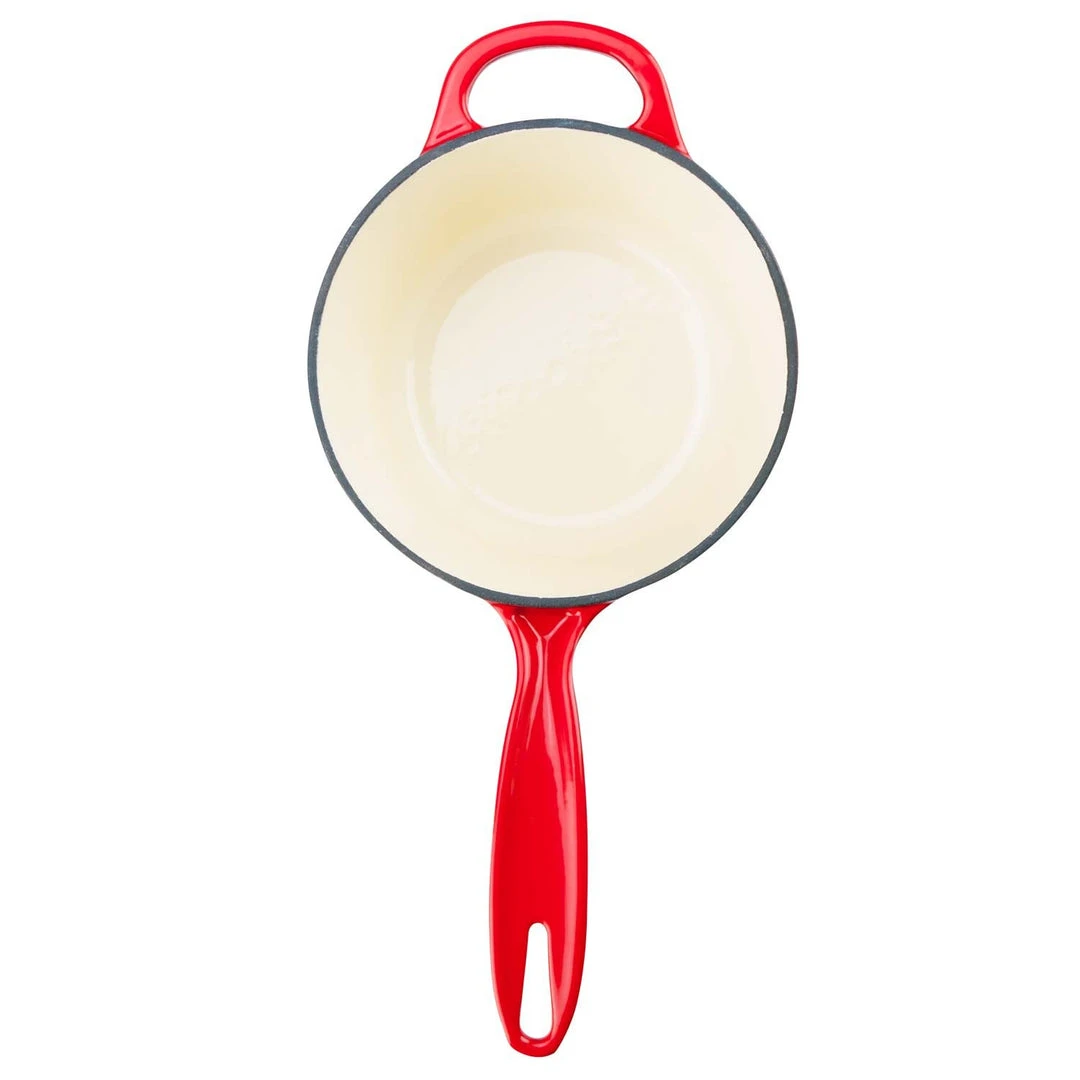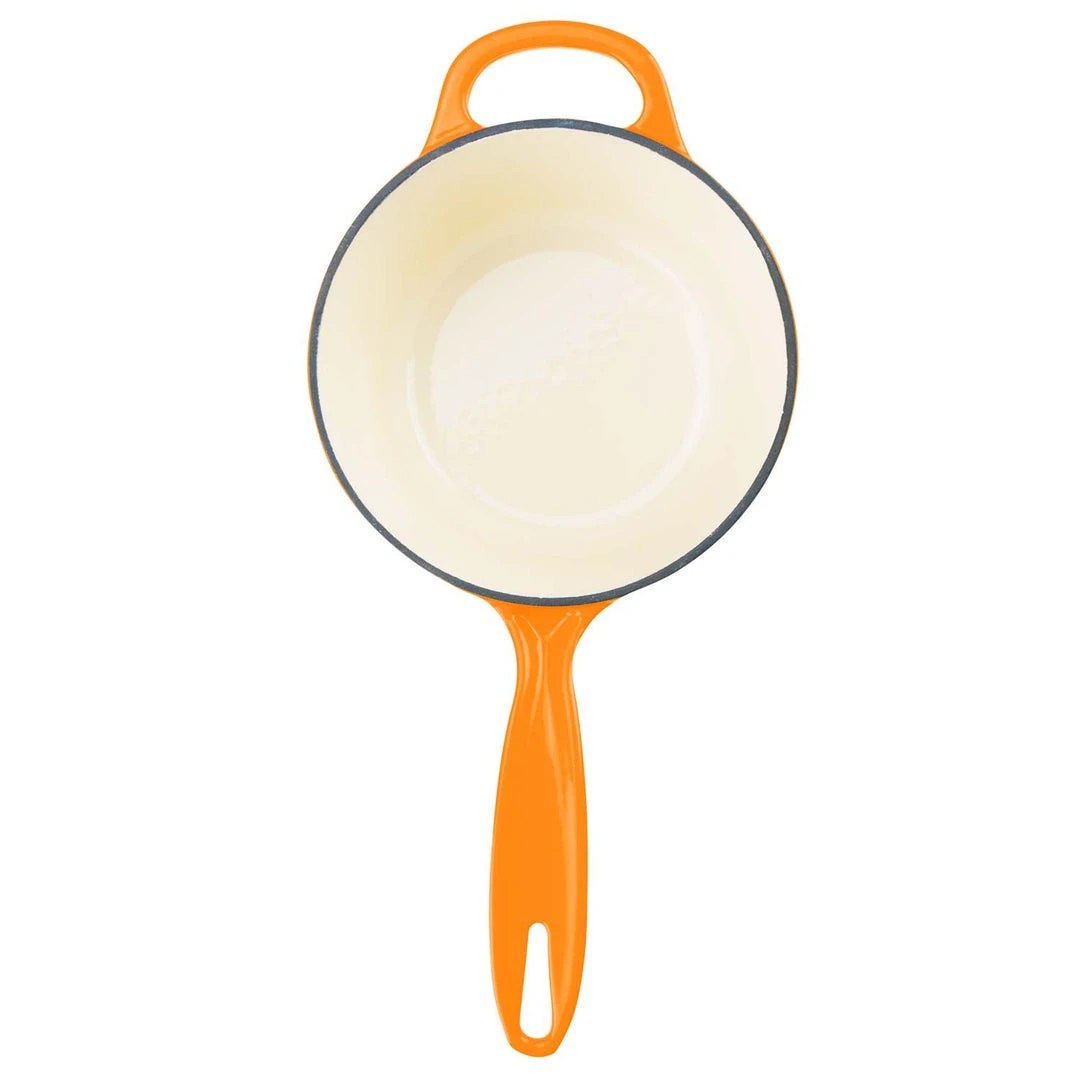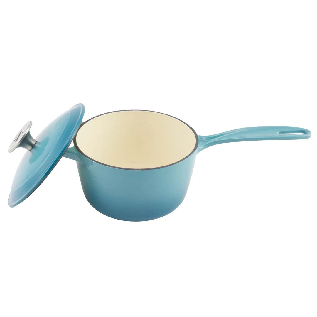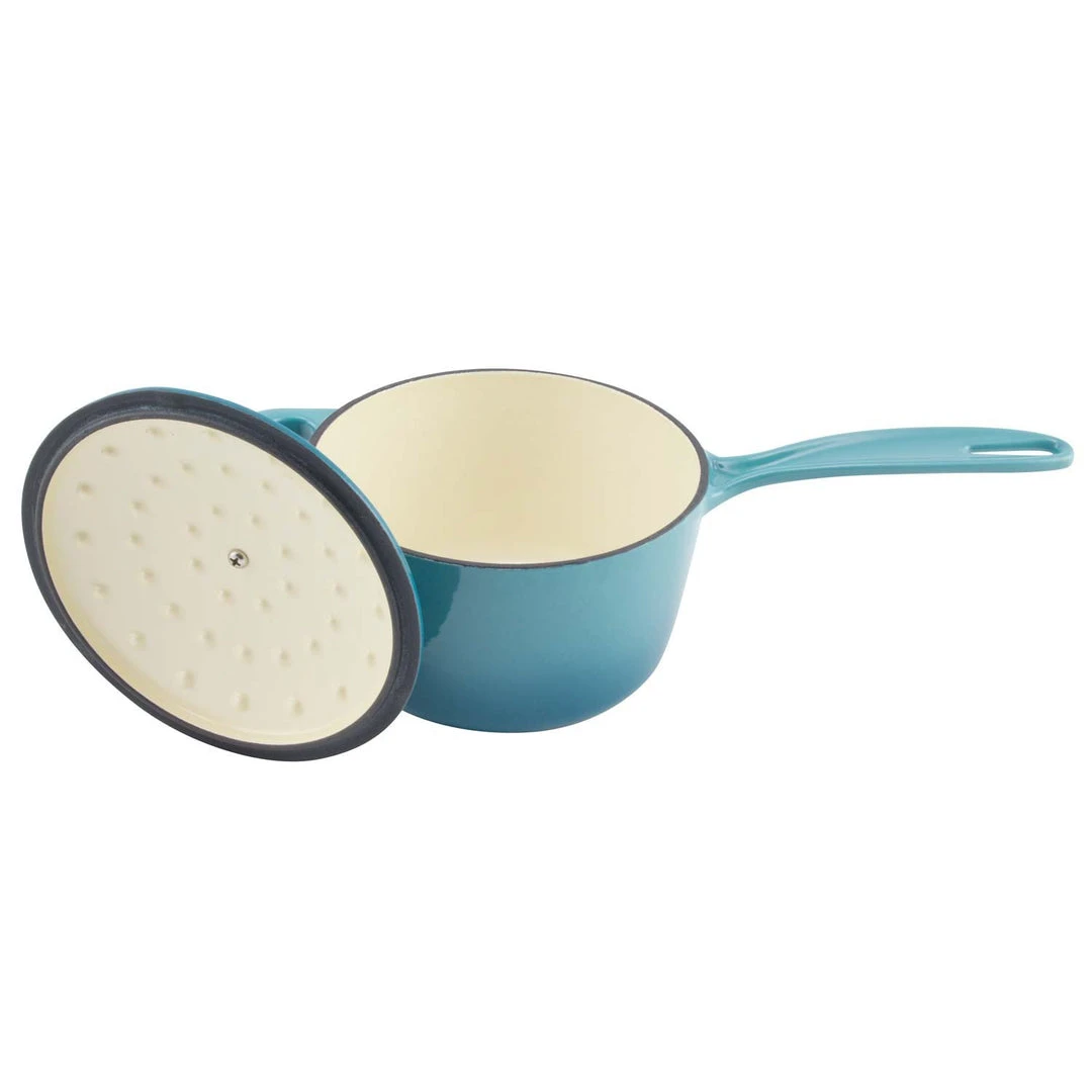This covered sauce pot is so versatile, you’ll use it every day. The heavy-duty cast iron construction distributes heat evenly so you can create soups, stews, and delicate sauces. The lid fits tightly to hold in flavor and the underside is covered with self-basting condensation bumps to keep your favorite recipes moist.  Available in teal, orange or red, it looks great on the pot rack, stove, or dining table. Engineered to resist staining, the three layers of porcelain enamel create a durable, chip-resistant finish that’s easy to care for. The sauce pot is heat resistant up to 500-degrees Fahrenheit, so it can be used on the stovetop or in the oven and it’s compatible with all cooktops. Hand wash your Zelancio enameled cast iron cookware to keep it looking and performing like new.
