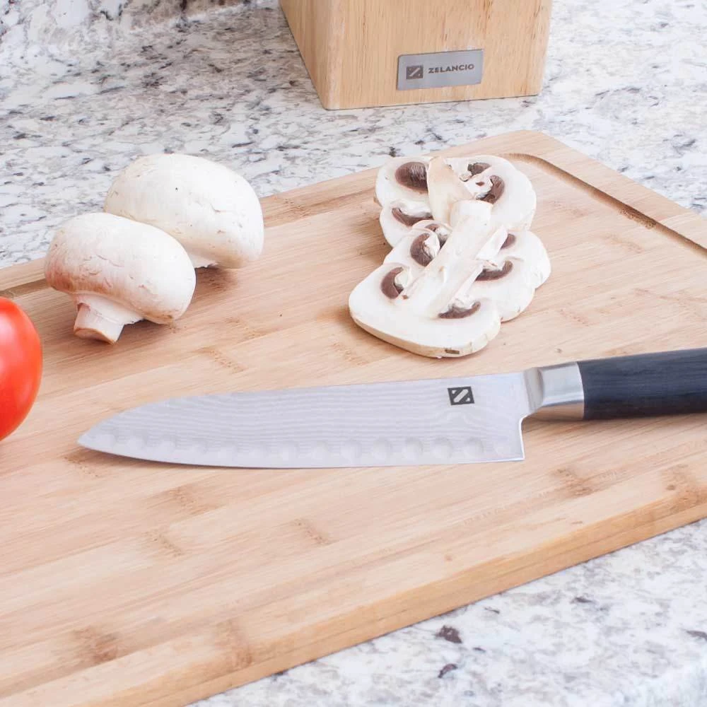 Damascus Steel is highly respected among professional chefs and sword collectors alike. Zelancio has combined this with a beautiful dark wood grained handle to complement and show off the elegant steel. The ergonomic handle features a comfortable grip that makes cutting a breeze and wrist soreness a thing of the past.