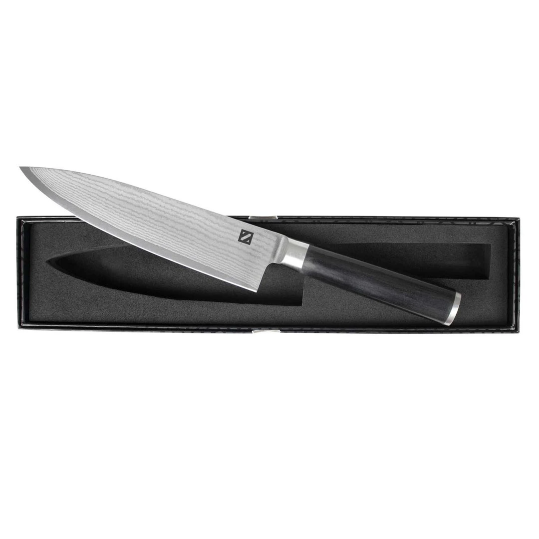 Prep like a pro! This 8-inch, professional grade chef’s knife has an asymmetrical, double-bevel edge blade to give you the superior control and precision. The blade is constructed with 67 layers of folded Damascus steel surrounding a premium Japanese VG-10 carbon steel core. This 8-inch multipurpose knife can be used for almost any culinary task. The naturally non-stick surface makes it easy to chop herbs and mince garlic or onions. Â Constructed of dark Pakkawood, the universal-grip handle has a comfortable, ergonomic design so you can cut, slice, dice, mince, and chop without hand or wrist fatigue.